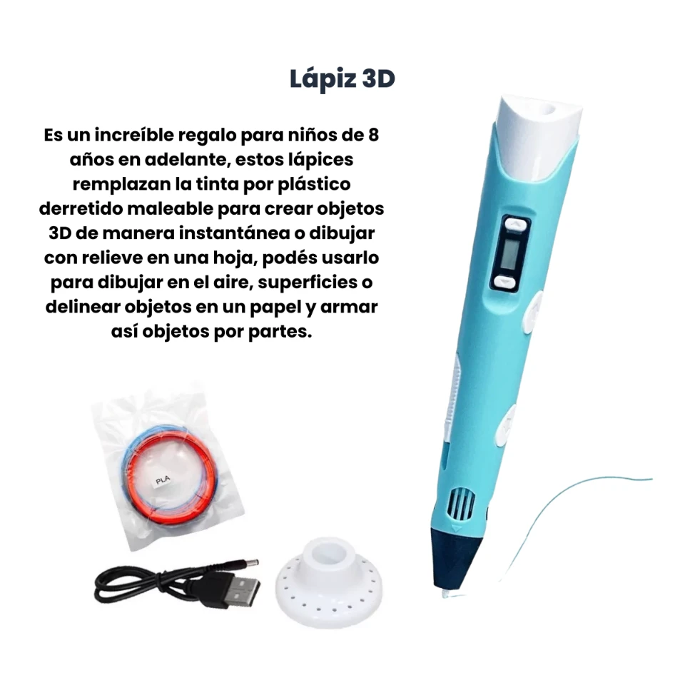 Es un increíble regalo para niños de 8 años en adelante, estos lápices remplazan la tinta por plástico derretido maleable para crear objetos 3D de manera instantánea o dibujar con relieve en una hoja, puedes usarlo para dibujar en el aire, superficies o delinear objetos en un papel y armar así objetos por partes.