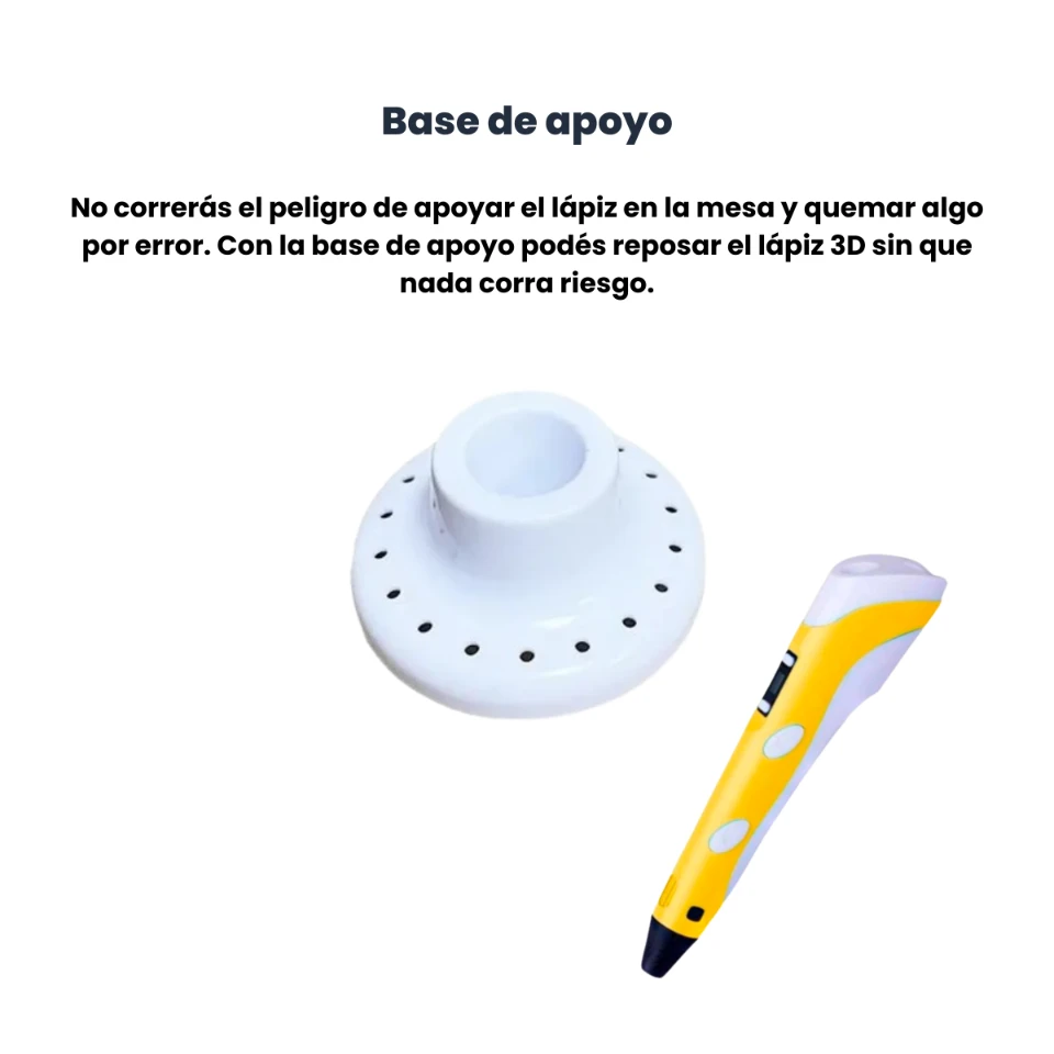 No correas el peligro de apoyar el lápiz en la mesa y quemar algo por error. Con la base de apoyo podes reposar el lápiz 3D sin que nada corra riesgo.